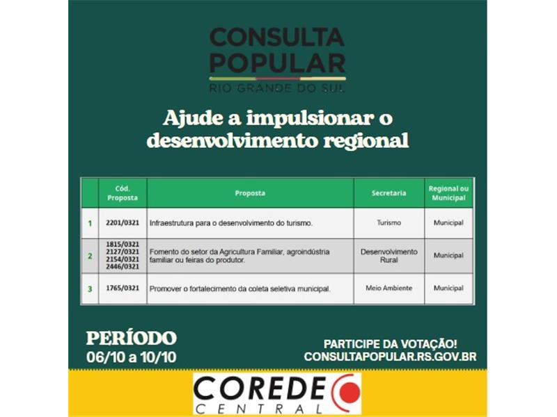 A Consulta Popular do Rio Grande do Sul é o processo democrático anual de consulta direta à população do RS em que os cidadãos votam para definir prioridades de interesse regional que receberão recursos do Orçamento estadual.